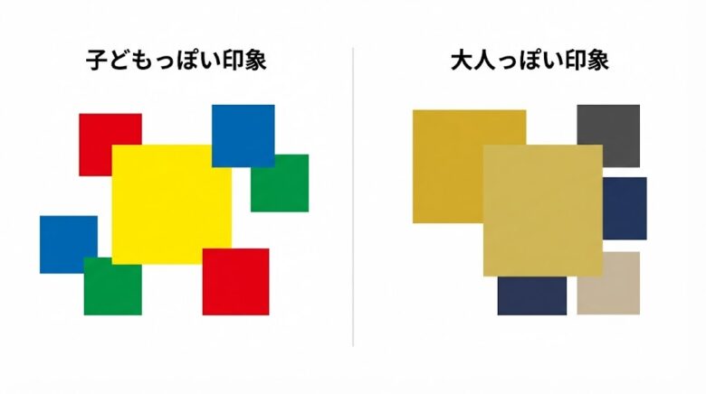 | 黄色+赤+青の原色を同じくらいの面積で使用 | カラフルさが強く、おもちゃのような印象になる | 赤や青の彩度を落とすか、グレーやネイビーに置き換える |