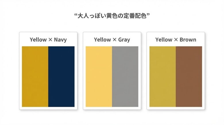 少しだけ組み合わせ方を変えるだけで、同じ黄色でも一気に「大人っぽい」「落ち着いている」に寄せることができます。