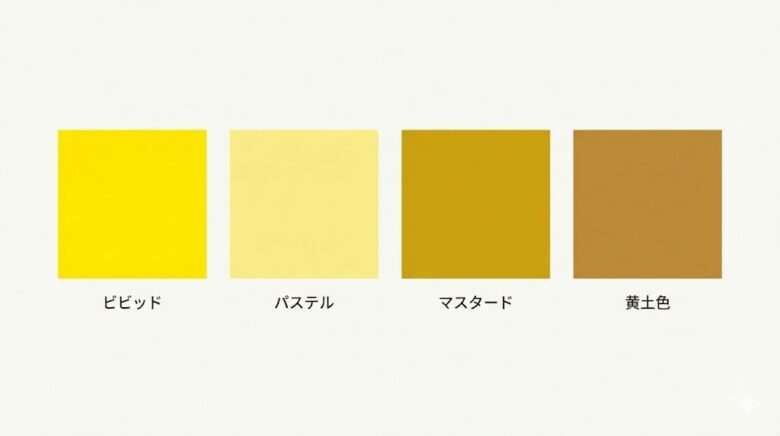 次に見るべきはトーンで、ビビッドな黄色のままか、少し彩度や明度を落としたマスタードやくすみイエローにするかで、印象は大きく変わります。
