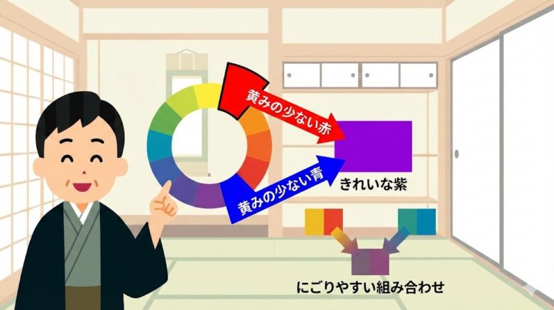 絵の具で紫色を作るとき、「赤と青を混ぜればいいはずなのに、濁った色になってしまう」と感じたことがある人は多いです。