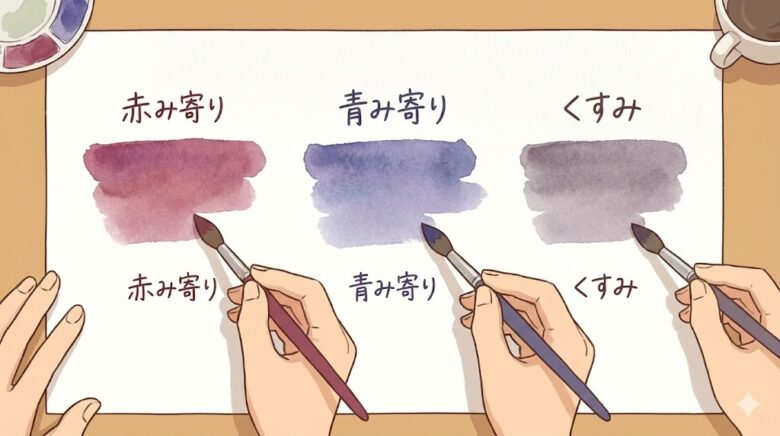 同じ「紫」でも、色味をはっきり決めてから混色を始めると、狙った雰囲気に近づけやすくなりますし、途中で迷ったときも「赤を足すか青を足すか」で修正の方向が見えやすくなります。
