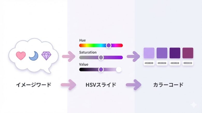 先にイメージワードを決めてからHSVを設定する流れにすると、「なんとなく選んだ結果」ではなく「意図した紫」が作りやすくなります。