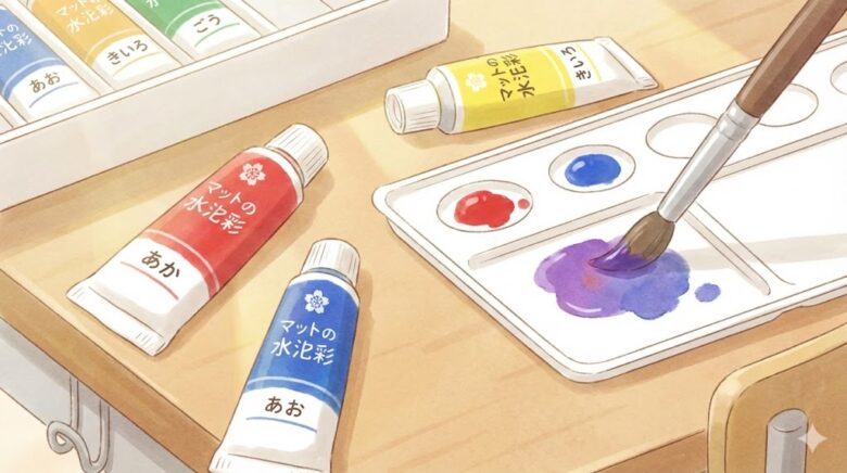 サクラ系のマット水彩やポリチューブ入りの学童用セットは、基本12色に紫が入らない構成も多く、その分「赤+青で紫を作る」前提になっている場合が多いです。