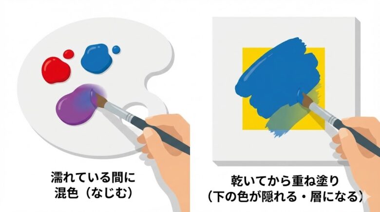 - アクリルは「濡れているうちの混色」と「乾いてからの重ね塗り」を分けて考えると結果が安定する。