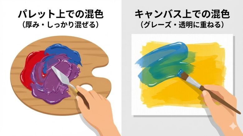 パレットナイフ・筆・溶き油で変わる混色の表情を整理する