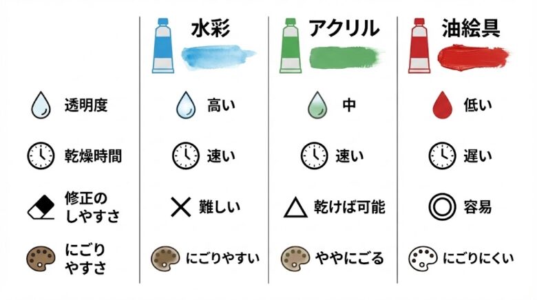 ここで一度、水彩・アクリル・油絵具の「混色に関わる性質」を整理しておくと、自分に合う画材と混色スタイルが見えやすくなります。