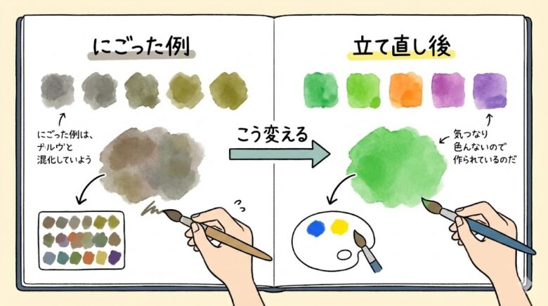 にごりは完全な失敗ではなく、「次に同じことを繰り返さないための手がかり」として整理しておくと、混色チャートづくりにも役立ちます。