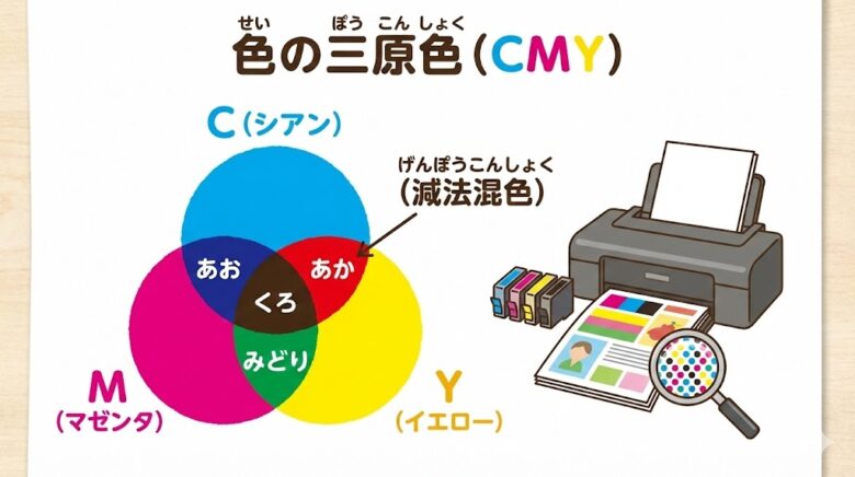 大人向けには、赤や青よりもマゼンタやシアンのほうが混色の自由度が高く、より鮮やかな色域をカバーできるという説明を足すと、プリンターでCMYが採用されている理由が腑に落ちやすくなります。