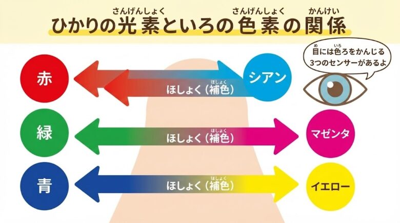 説明するときは「光の三原色は赤・緑・青の光で、増やすと白に近づく」「色の三原色はシアン・マゼンタ・イエローのインクで、重ねると黒に近づく」と、光とインクの違いを必ず一緒に伝えるようにしましょう。