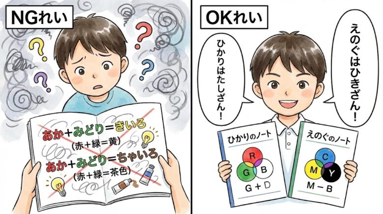 「混ぜる」という一つの言葉で両方を説明してしまうと、足し算の混ぜると引き算の混ぜるがごちゃごちゃになりやすく、説明するときは必ず「光を足す」「インクを重ねる」など言葉を微妙に変えて使うことがポイントになります。